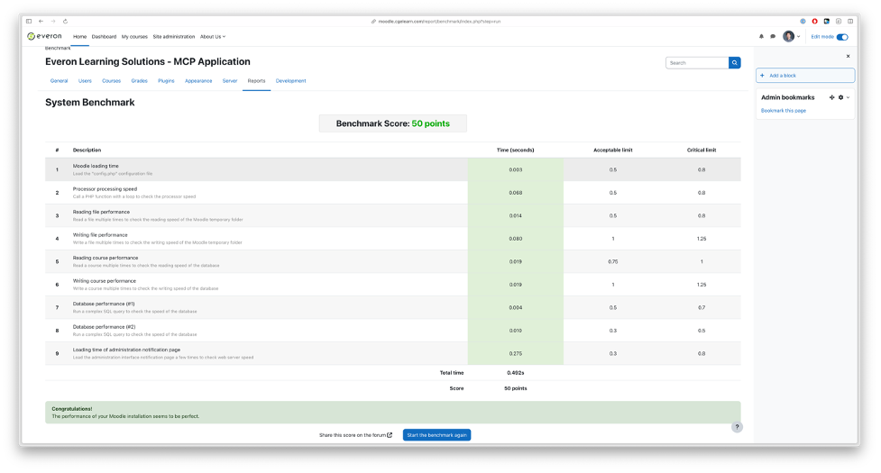 Below is an overview of the performance and security settings for this Moodle instance. Our team has a collective 40+ years of Moodle experience and we hope this is evidenced by the comprehensive Moodle install and setup.